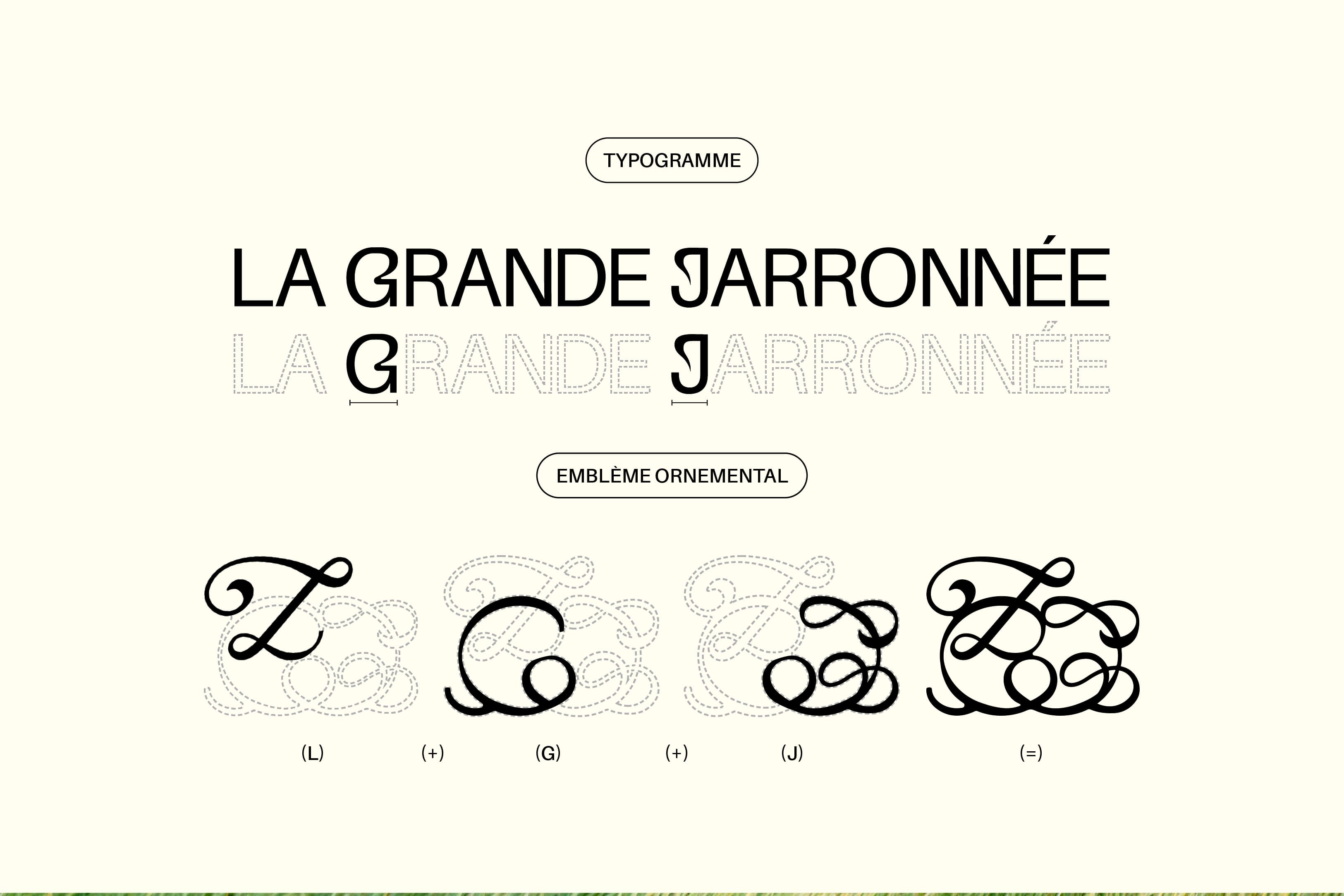 Le typogramme laisse apparaître la végétation du terrain. Il est accompagné d'un emblème ornemental prenant inspiration des portails art nouveau et qui est présent sur les déclinaisons prints ainsi que sur le linge de maison.