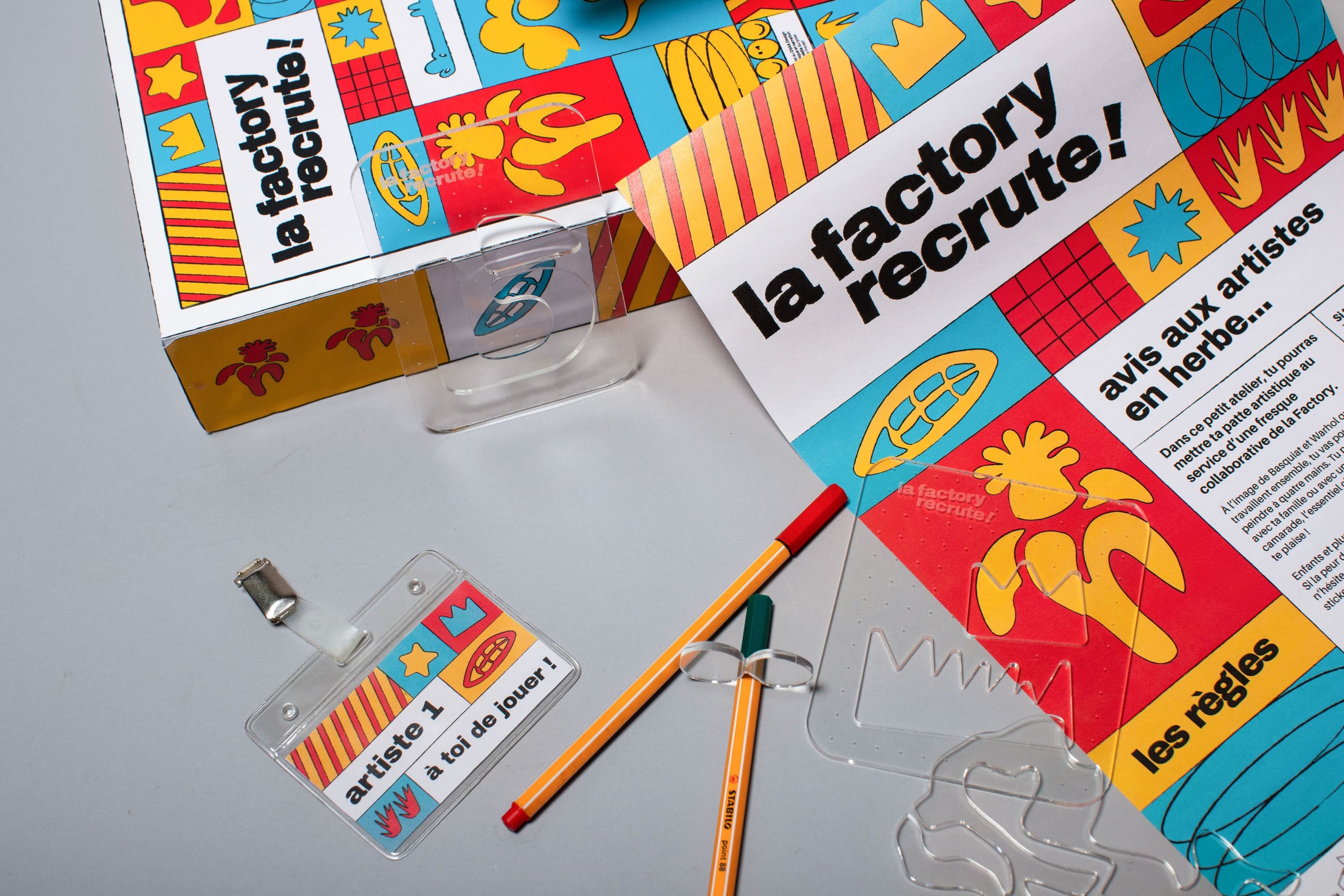 Les visiteur·euses ont été invité·es à collaborer dans la réalisation d'une fresque, grâce à des outils et pochoirs inspirés de l'exposition en cours. Pour cela, nous nous sommes inspiré·es des formes récurrentes présentent dans les œuvres des deux artistes puis nous avons développé une identité colorée et tout public. Le principe de la mise en page évoque les jeux de construction pour enfants ainsi que la collaboration.