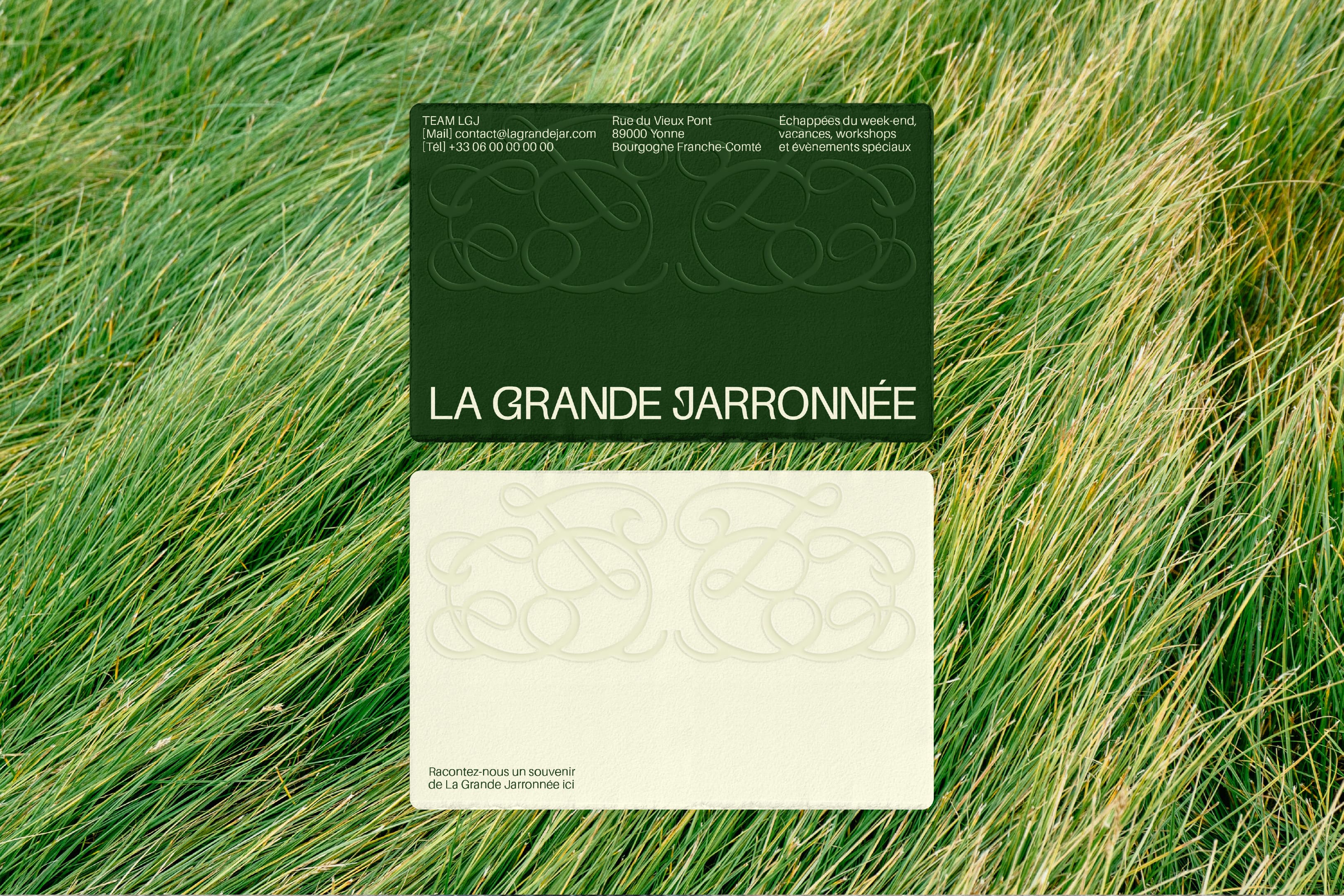 Le typogramme laisse apparaître la végétation du terrain. Il est accompagné d'un emblème ornemental prenant inspiration des portails art nouveau et qui est présent sur les déclinaisons prints ainsi que sur le linge de maison.