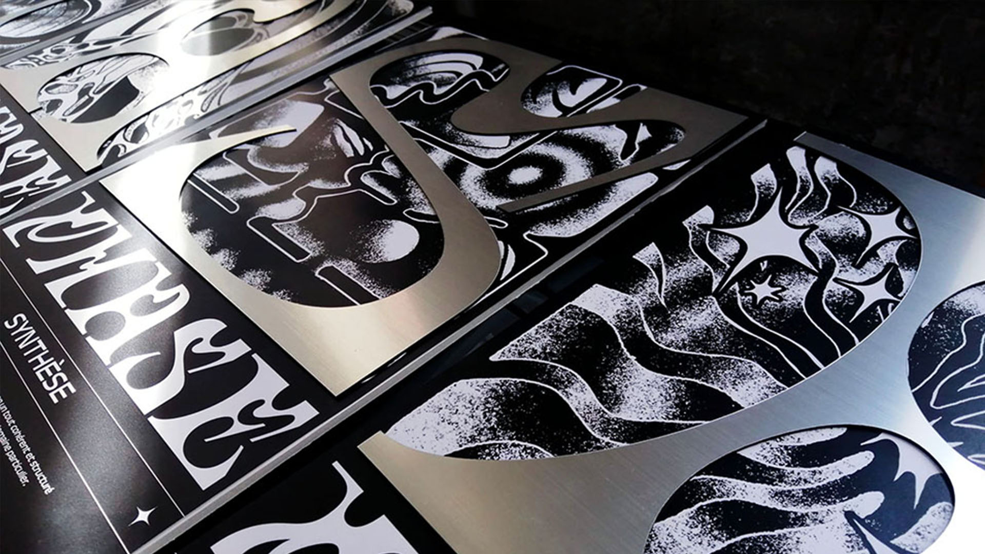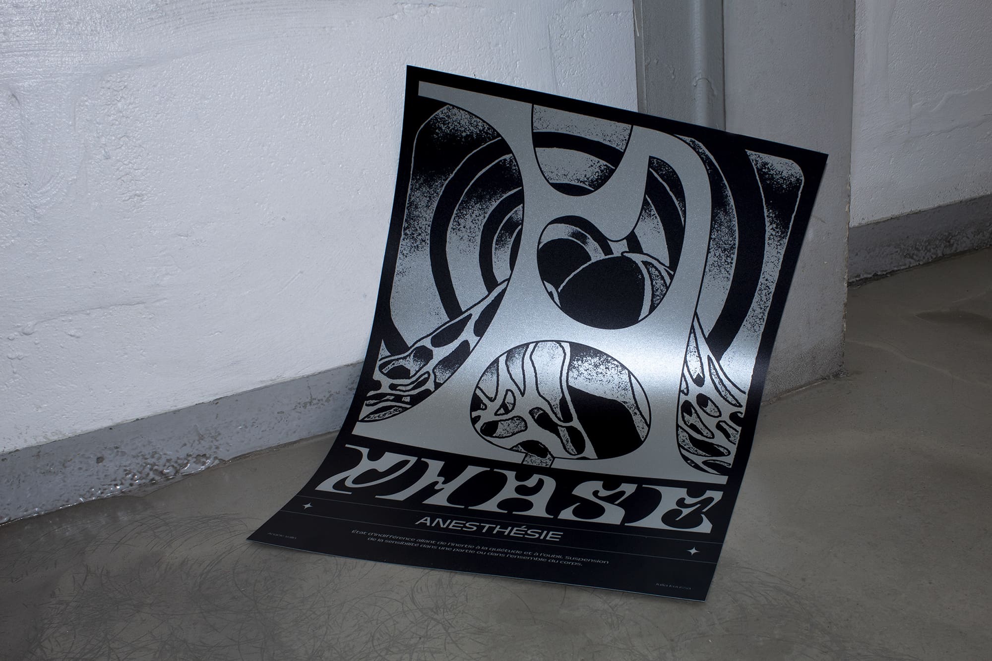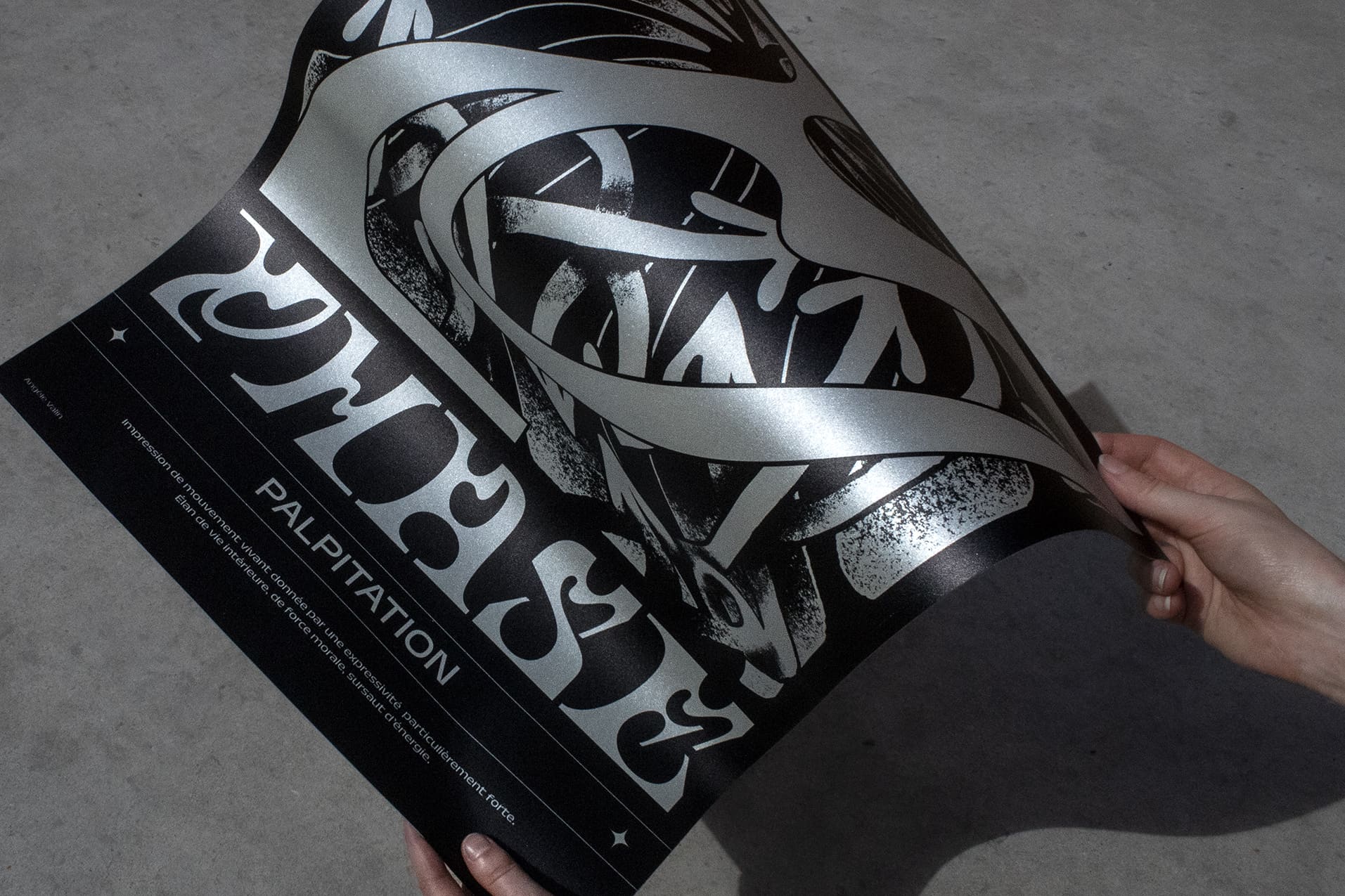 Série d'affiches imprimée sur papier argenté, mélant illustration et typographie sur le thème du processus créatif en design graphique.