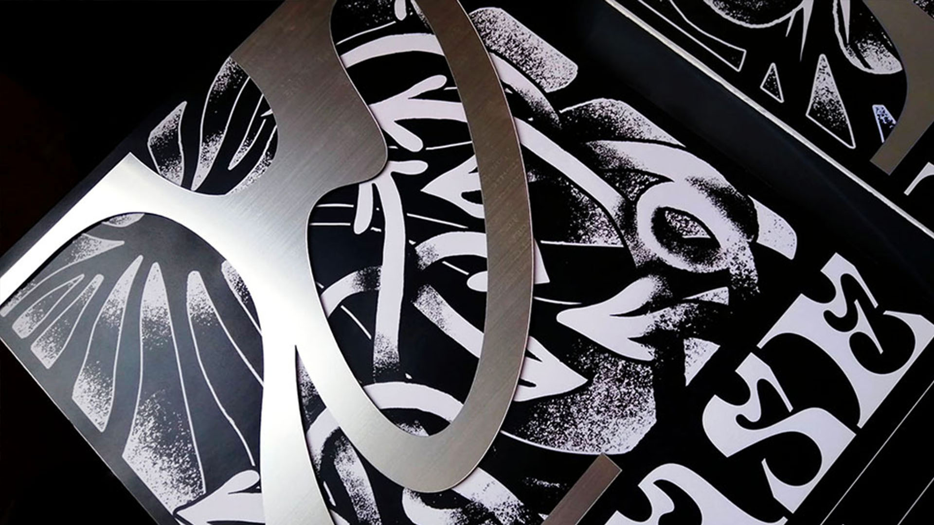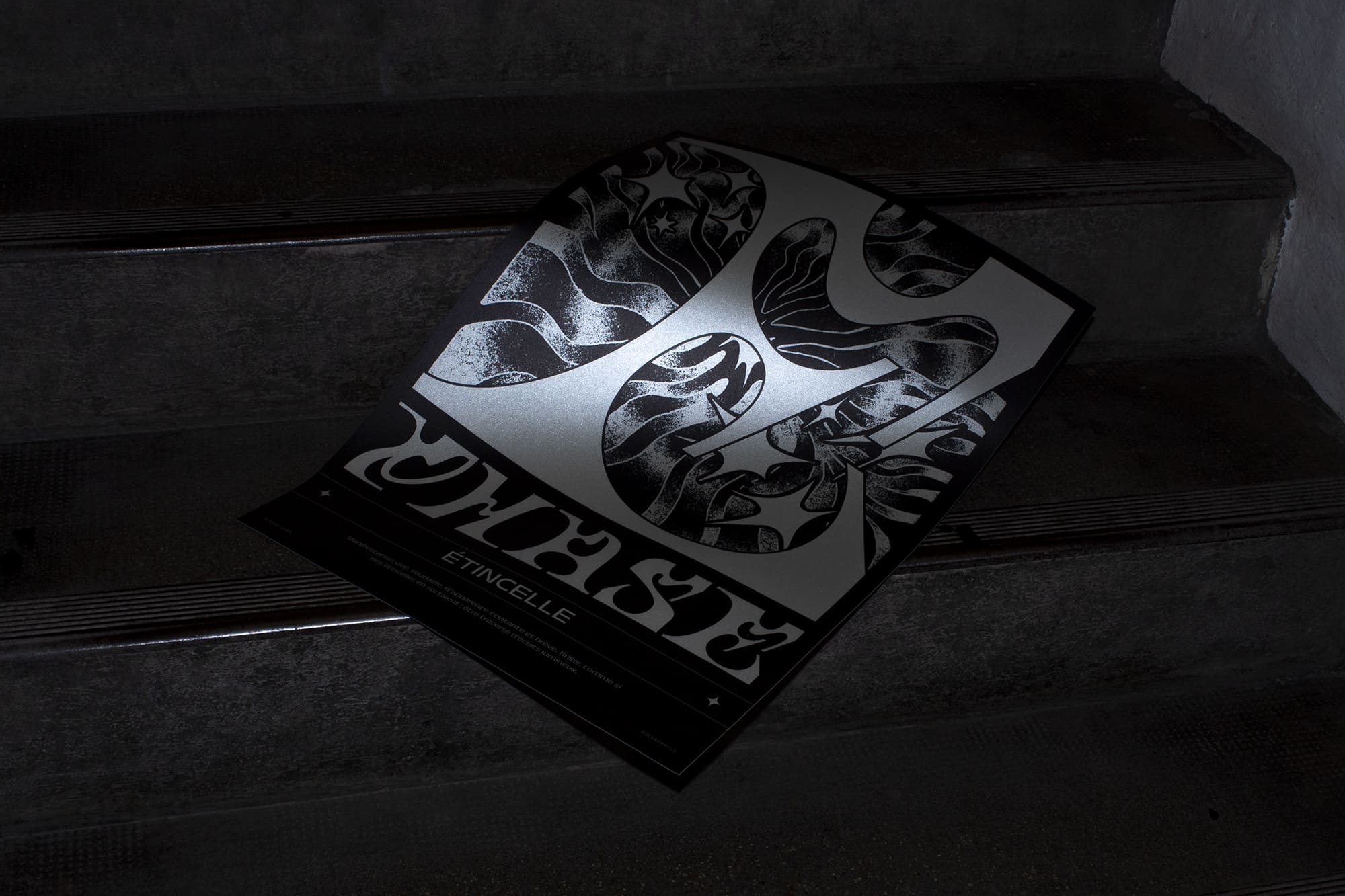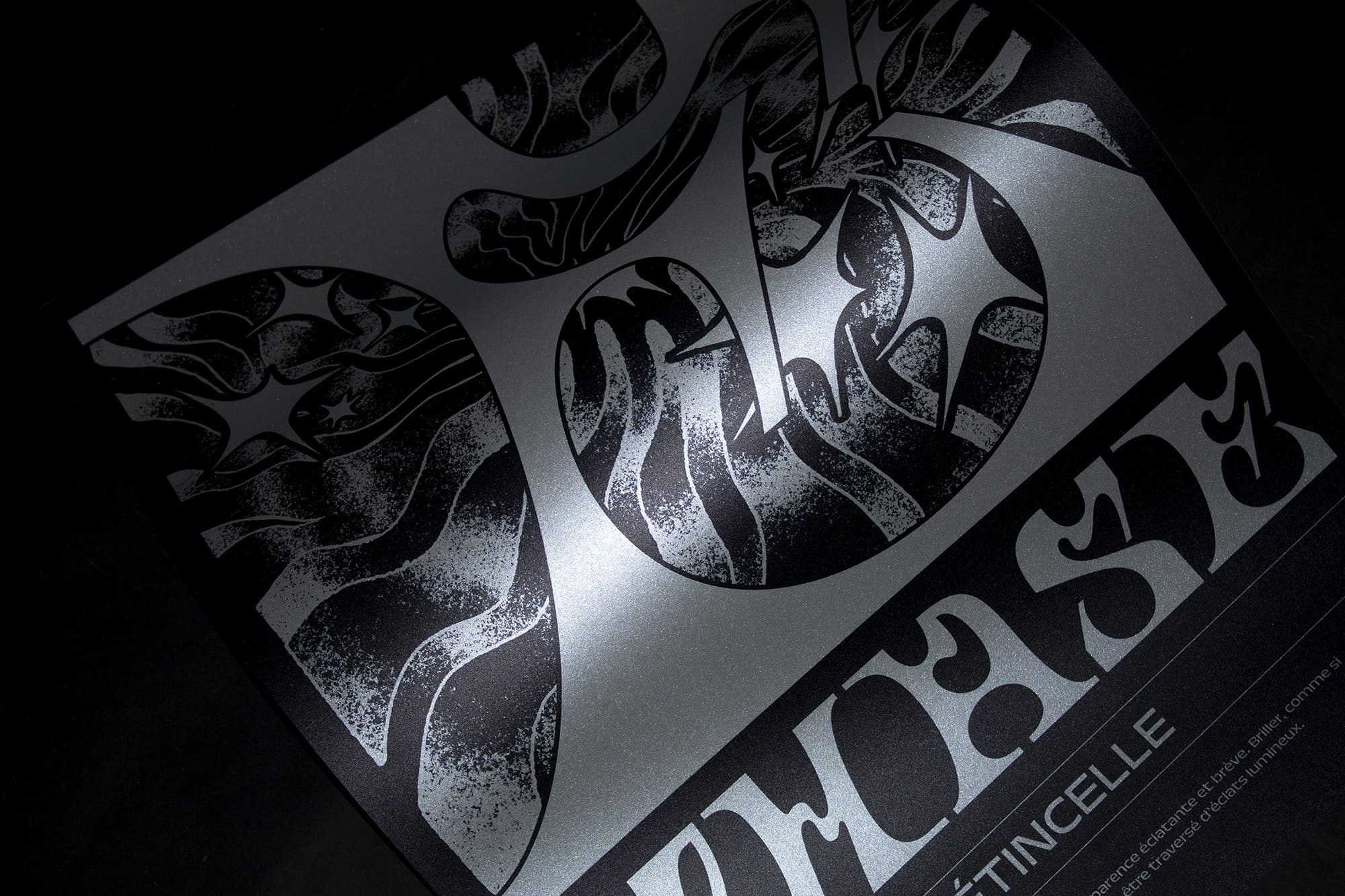 Série d'affiches imprimée sur papier argenté, mélant illustration et typographie sur le thème du processus créatif en design graphique.
